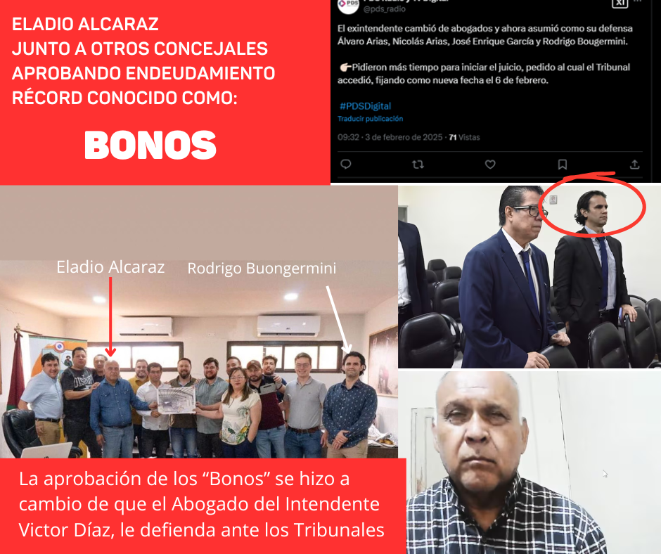 Pues como los hechos nos muestran, la defensa jurídica del mismísimo Eladio Alcaraz, está a cargo del Abogado del Intendente Víctor Díaz, o sea, el Abog. Rodrigo Buongermini.
